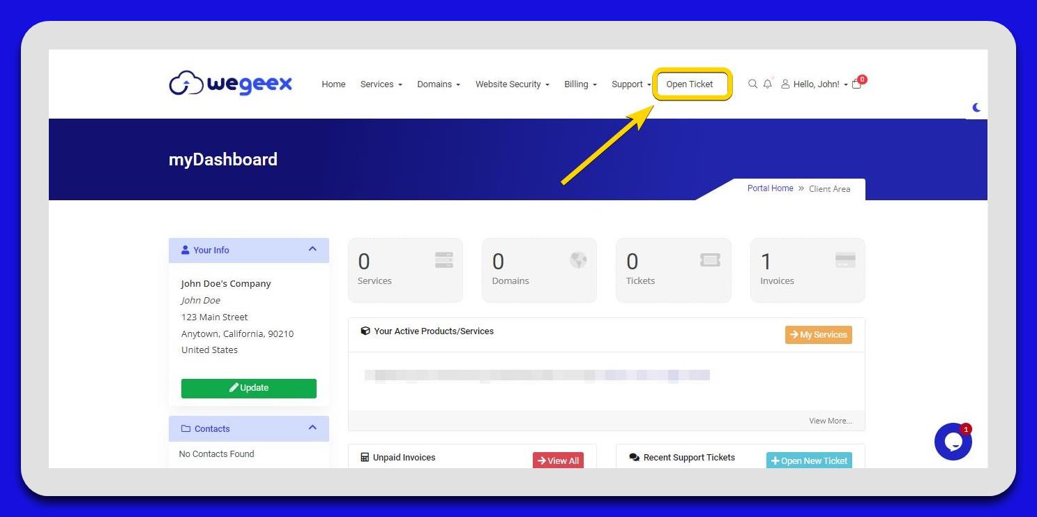 2.1. In the top menu of your client panel, click on the "Open ticket" option.